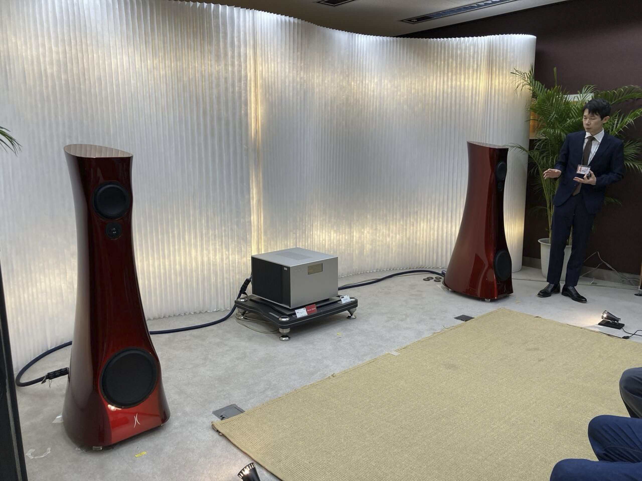 The loudspeakers were presented with Siltech cables, Bassocontinuo audio racks, and electronics from Soulution, including the 727 Preamplifier, 757 Phono Preamplifier, and 717 Stereo Power Amplifier. The system also featured the Dr. Feickert Analogue Firebird turntable and a Passive Preamplifier from The Bespoke Audio Company.